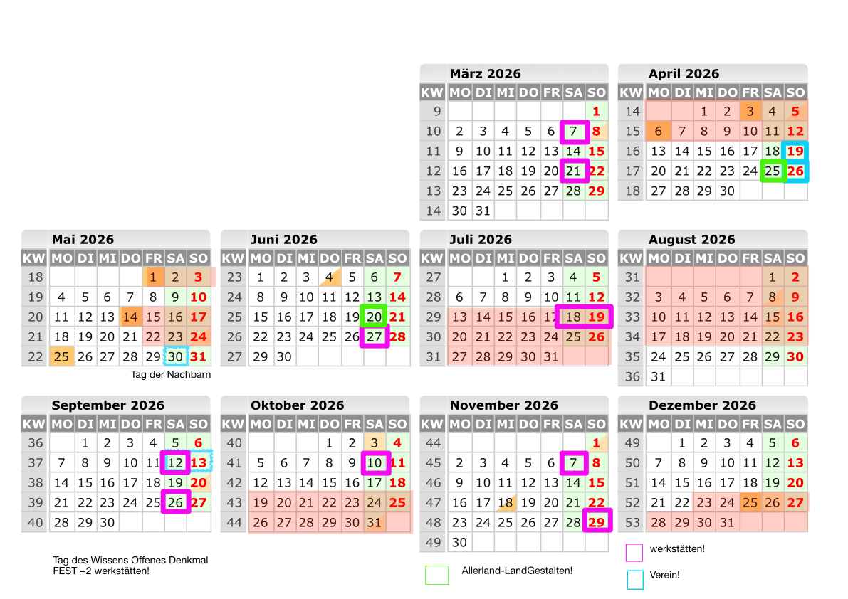 Ein Samstag würde sich als Werkstatttag gut eignen, es dürfen aber auch andere Wochentage vorgeschlagen werden. Bei der Terminwahl sollten Ferien und Brückentage berücksichtigt werden. Hier findest du eine Kalenderübersicht.